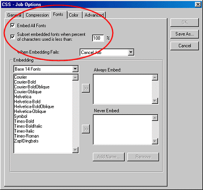 Next, click on the "Fonts" tab and enable font embedding as shown in the third figure.
