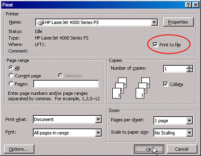 Select the postscript printer that you installed, check "Print to file" and click on OK.
